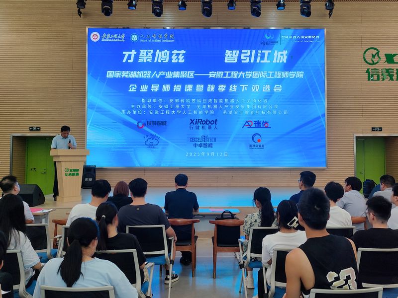 9月12日下午,人工智能学院与国家芜湖机器人产业集团联合举办的机器人冠名班企业导师授课暨秋季线下双选会在安徽工程大学国际工程师学院梦溪才艺大厅隆重举行。本次活动以“课程、项目、招聘三位一体”为核心,旨在推动机器人产业链与高校人才培养深度融合,为学生搭建更精准、高效的就业通道,助力企业精准引才。