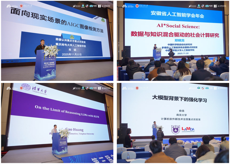 在大会主题报告环节,重庆邮电大学教授肖斌,中国科学院自动化研究所研究员郑晓龙,清华大学自动化系副教授黄高,南京大学人工智能学院副院长俞杨分别作了“面向现实场景的生成图像检测理论与方法研究”、“数据与知识混合驱动的社会计算与决策智能研究”、“推理大模型的能与不能”、“大模型背景下的强化学习”的主旨报告,围绕人工智能前沿技术和产业发展进行深度交流。中国科学技术大学特任教授王文杰,浙江大学智能科学与工业软件所副所长、特聘研究员张宁豫分别作了“大模型个性化研究与应用”、“知识驱动大模型智能体”的青年学者讲习班报告,围绕如何聚焦人工智能前沿技术,不断拓宽学术视野、把握前沿技术趋势,与参会青年教师和研究生进行了交流探讨。