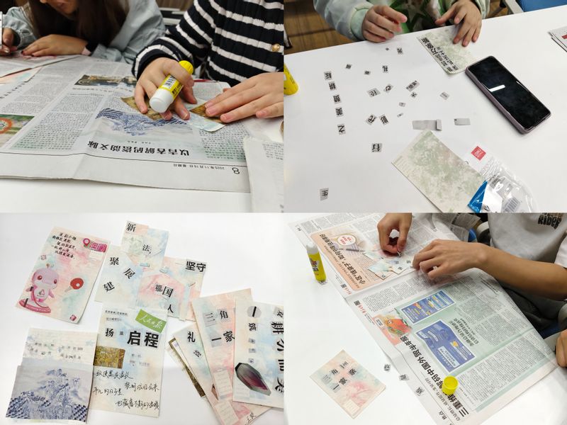 在创意拼贴诗活动环节,同学们围绕诗词或励志话语主题,结合自身积累相互交流、集思广益、默契配合,在串联字词、打磨作品的过程中碰撞思维火花,现场氛围热烈融洽。各组齐心协力完成诗词拼接作品后,依次上台进行成果展示,逐一分享本组的创作思路与作品内涵,在交流中感受中华诗词的独特魅力,在协作中加深彼此的了解与信任。