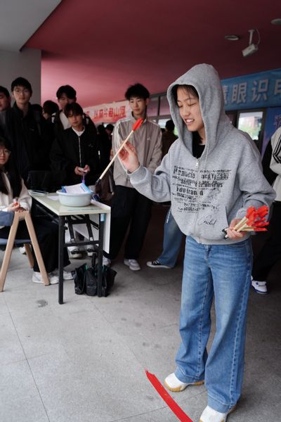 “一二、一二……”伴随着整齐的口号声,“青春力量挑战区”的“众志成城”多人多足竞速赛正激烈上演。同学们两三结对,绑住双腿并肩冲刺,在欢笑与汗水中诠释了团结协作的拼搏精神。引人注目的“掷地有声”投壶,箭矢上贴着“理想”“奋斗”“担当”,投壶桶上则是“迷茫”“躺平”“懒惰”。同学们精准投掷,用正能量的箭矢强势“击退”负能量,尽显青年拒绝躺平、挺膺担当的昂扬锐气。